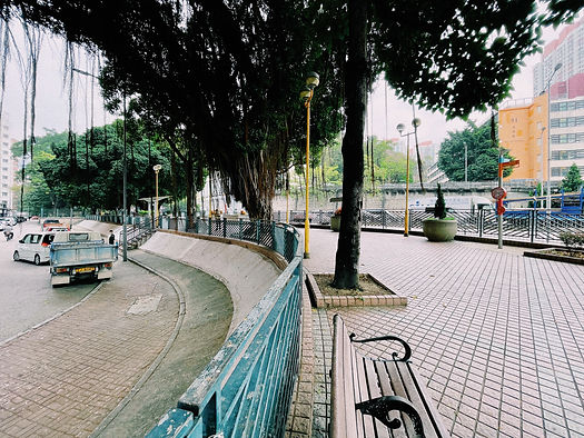 The rest garden is located on a J-shaped gently sloping site at the corner framed by the Tai Po Road/Castle Peak Road intersection and Kowloon Road, having an area of 954 square metres and a maximum of 2.7 metres height difference with Kowloon Road. The sitting-out area is planted with Ficus microcarpa along the east and west, with low-hanging canopies enveloping the garden like a tree-lined avenue. The square tree beds and circular flowerbeds also add to the geometric atmosphere. Given that the site is beyond the western end of Sheung Li Uk Garden, it can be regarded as its extension. Thus, a green scenic corridor forms from north to south, starting from the Lei Cheng Uk Playground, Sheung Li Uk Garden, to the rest garden, providing citizens an energising belt of gardens.
