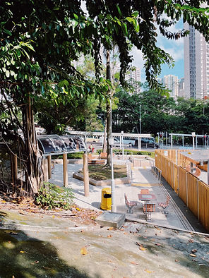 ‘Po Kong’ means the hills where people from Putian live. During the Southern Song Dynasty, the Lam Clan from Putian in eastern Fujian is claimed to have gone south and settled in Hong Kong. The indigenous village has long disappeared, currently becoming the area of Diamond Hill MTR Station and Po Kong Village Road. Po Kong Interchange Rest Garden is located on the boundaries of Diamond Hill and Tsz Wan Shan areas. Po Kong Village Road, Shung Wah Street and Po Tsz Lane delineate the triangular boundary of the rest garden. On the side of Po Tsz Lane and the community centre is a large retaining wall, planted with a sturdy large-leaf fig whose canopy can cover the entire rest garden, and an arched pavilion underneath. On the side near Shung Wah Street is also a pet park, but it cannot be accessed from the rest garden.