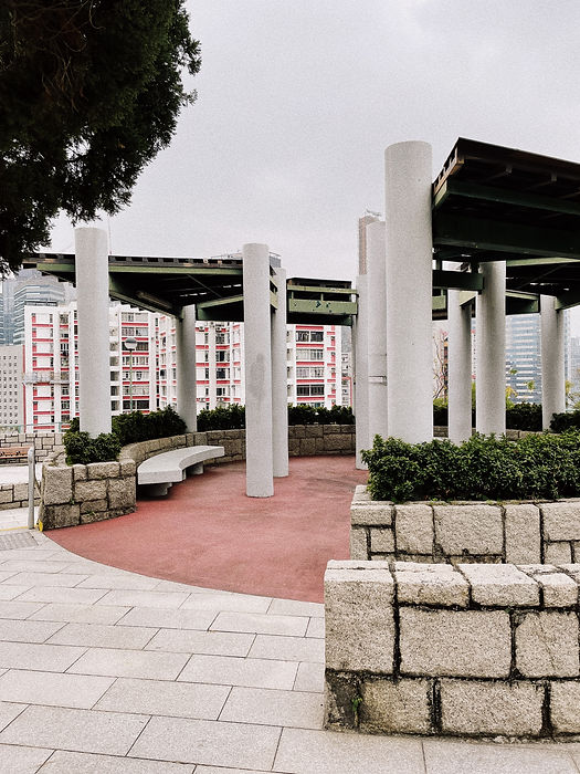 The sitting-out area, built in 1979, is located on the retaining slope of Kwun Tung’s Crocodile Hill, on the south along the bend of Hong Lee Road, and surrounded by typical low-density residential areas of Kwun Tong Mid-levels. The sitting-out area comprises four circular platforms that are connected by flowerbeds, creating various height perspectives and spatial nodes. Among the four platforms, three with 12-metre diameters are equipped with pavilions, benches and waist-height planting beds, spread out in concentric hexagons. The large platform of 15-metre diameter is designed as an open plaza with benches placed along its edge. Users of the rest garden can enjoy scenic views of Ngau Tau Kok, Kowloon Bay Business Area and even the Victoria Harbour without obstructions.