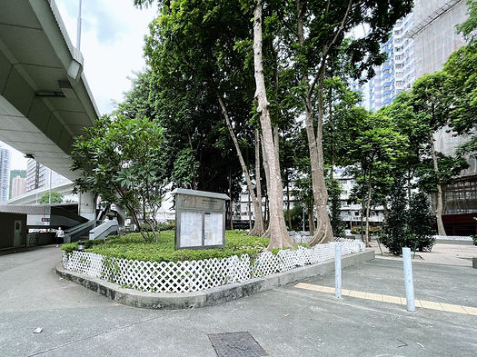 The Kwai Chung Castle Peak Road Sitting-out Area is located at the site bounded by Kwai Chung Road, Castle Peak Road (including flyovers), the intersection of the pedestrian bridge system and two adjacent industrial buildings. The crossing stairs at the entrance of the footbridge on Kwai Chung Road are approaching like a curtain layer upon layer, and the piers of the Castle Peak Road flyover surround the site in a fluid manner, like striking towers. The centre of the sitting-out area is surrounded by a three-layer annular tree array, which has a great sense of stage space; in the corner near the road stands a Ficus elastica with a trunk diameter of about 5 metres, and its canopy can cover half of the venue. Chukrasia tabularis and Roystonea regia scramble upward and cross the overpass to absorb sunlight and nutrients.