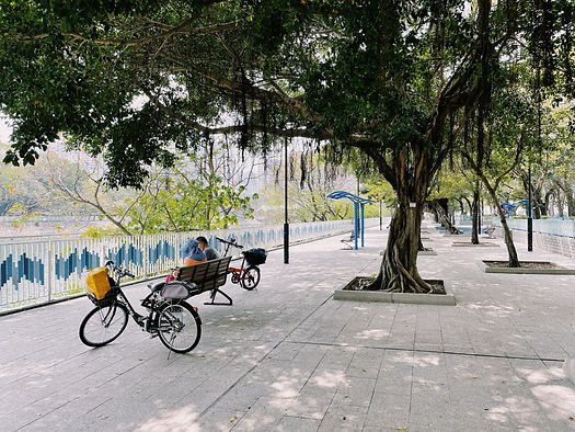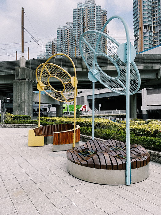 In the 1970s, Tuen Mun was reclaimed and developed into a new town. The reclamation narrowed most of Castle Peak Bay into a man-made river, while the Tuen Mun Estuary originally from Pui To Road to Hau Kok Tin Hau Temple was moved south, where the current form of the Tuen Mun Nullah gradually took shape. The rest garden was built in 1978 as a post-reclamation resting promenade. The promenade spans 300 metres along the coastline, used as a barrier between the river and adjacent industrial land. With the opening of Tuen Mun Station of the KCR West Rail (now Tuen Ma Line) in 2003, the rest garden was rebuilt in 2007 to its present appearance. The northern end is the Transport Department’s public bicycle parking space with an elevated railway, while the west side borders at New Territories Cycle Track. In the rest garden, three large planting beds and fitness stations organise its layout, with gazebos, seats and scattered trees along the river. Two installations under the “Viva! River” public art scheme are also placed at the northern entrance. The installations are vibrant, eye-catching, and forming a place for the public to rest, relax, exchange ideas and be creative. Since the 1980s, the water quality of the Tuen Mun Nullah has greatly improved thanks to the monitoring and improvements by government departments and the District Council. A wetland-like habitat has formed in the berthing from the central to the southern part of the rest garden, where water birds often come seeking for food, a symbol of the site’s liveliness.