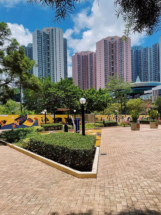 In the early days of the Tseung Kwan O New Town Project in the 1970s, the Tseung Kwan O Town Centre was planned to be located in Po Lam. It was not until 1982, when the Government formally launched the Tseung Kwan O New Town Development Project, that the location of town centre got moved south-eastwards to the new reclamation area—southeast of Hang Hau and Tiu Keng Leng, around what is now Sheung Tak Estate and Tong Ming Court. Located at the southwest corner of the Tong Ming Street and Tong Chun Street intersection, the Tong Ming Street Sitting-out Area covers an area of about 2,200 square metres and was opened in 2009. Two children’s play areas are divided by irregular flower beds, with colourful bumper mats and geometric floor coverings to enrich the visual experience of users. Likewise, shrubs growing in the flower garden, such as Ixora chinensis, Loropetalum chinense f. rubrum, Cordyline fruticosa and Murraya paniculata, are all chosen to add colour and spatial layering to the space. The most notable feature of the sitting-out area is the community picture wall that separates the area from the Tong Ming Street Park. Community members have painted the scenery of Tseung Kwan O, encouraging residents to incorporate art into their neighbourhood while adding an artistic and vibrant place to the city.