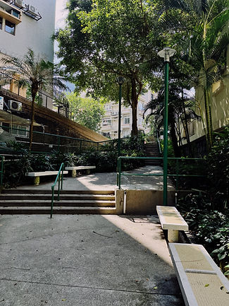 Blue Pool Road is named after the old Blue Pool, a lake in Wong Nai Chung Village, Happy Valley, where its water originates from a stream at Wong Nai Chung Gap. Over the decades, the area around Lam Tong Road has developed into a low-density luxury residential area. Located in the middle section of Blue Pool Road, the entrance of the sitting-out area is around 2 metres wide and barely noticeable from the road. Formerly a triangular vacant lot, the site was converted into a sitting-out area in 1987. Measured around 245 square metres, the sitting-out area occupies a L-shaped corner semi-encircling the residential buildings of Blue Garden, and is separated from the building by fences covered with climbing plants such as Epiprennum aureum Bunt. and Rohdea japonica. The culvert at the southeast foot of Jardine’s Lookout is located directly beneath the site, so additional benches are provided for visitors to view the gushing drains from upstream, awakening a keen sense of nature. Light can only enter the site through gaps between the buildings. With confined space and humid microclimate, this sitting-out area is cool and tranquil and suitable for the growth of Hymenocallis littoralis (Jacq.) Salisb., Cordyline fruticosa, Rhapis excelsa, and Dracaena fragrans variegata.