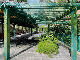 Tai Tam Reservoir Road Sitting-out Area is located in the middle of Wong Nai Chung Gap area, across the road from Wong Nai Chung Reservoir. Various popular countryside routes passed through the site, such as Black’s Link, Hong Kong Trail Section 5 and Sir Cecil’s Ride. With a size of 740 square metres when it was opened in 1985, the site further expanded southward by 237 square metres in 1992. The sitting-out area is built on two terraces with a height difference of about 2.3 metres, and is covered by a sizeable truss canopy measuring 13.5 metres in width, 20.5 metres in length, and about 6.5 metres in height. Columns and beams of the canopy are connected by simple joints, demonstrating an intrinsic structural beauty. The canopy over the upper terrace is wrapped in Bauhinia corymbosa. In early summer, pale pink flowers bursting into a sea and the new foliage and curling branches entwined with the rusted beams that have naturally patinated over time. Branches of the Terminalia catappa on the lower terrace pass through the gap between canopy beams to reach upward. A 6 m by 9.6 m void is strategically located in the centre of the truss canopy to avoid the dense climbing plants blocking daylight and breezes.