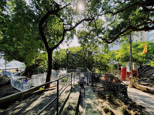 The rest garden is located at the southern end of Aberdeen Old Main Street, on a rocky outcrop at the foot of the slope leading to the Old Aberdeen Police Station. Before the reclamation of the Aberdeen Typhoon Shelter in the 1980s, the site was the high point of the waterfront and was built as a rest garden in 1992. The garden is perched on a rocky terrain, forming four small platforms of varying heights with views of the Aberdeen Typhoon Shelter and Ap Lei Chau across the water. On both sides of the ramp at the garden entrance, are mini temples dedicated to various deities such as Kwun Yum, Tai Wong Yeh, Supreme Emperor of the Dark Heaven, Kwan Tai (Gwan Yu), Lord of the Ground and Goddess of the Sea. There are also large and small statues placed on the retaining slope. As Aberdeen was once an important fishing and shipbuilding area, there used to be many Tanka dwellers in the area, where fishing boats and sampans moored. The century-old “mini temple cluster” allow fishermen of all beliefs to pray for blessings before they set sail. This custom perpetuates and “mini temple cluster” is preserved in the rest garden.