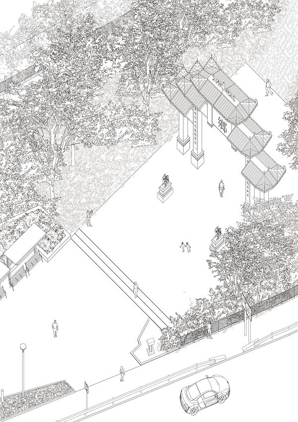 Pat Heung Road is a branch road of the Route 3 (Country Park Section) project. After the Pat Heung Depot was built by the KCR West Rail (now Tuen Ma Line), Pat Heung Road viaduct was built to connect Route 3 to the west and village road to the east of the depot and was opened to traffic in 2001. In 2005, in order to mitigate the negative impact of the railway ground work on the feng shui of the Pat Heung area, KCR donated and built the Pat Heung Arch, a Chinese style paifang at the foot of the east side of the Pat Heung Road viaduct. Area around the paifang has since become a place for villagers to worship and give blessings. In 2018, the vacant land in front of the paifang was transformed by LCSD into a sitting-out area. It occupies a 650-square-metre site sandwiched by the Pat Heung Road roundabout and the viaduct. A T-shaped flowerbed surrounds the northwest side of the site and extends to the foot of the viaduct. Two pavilions are arranged along the flowerbed to provide shade and seating places.